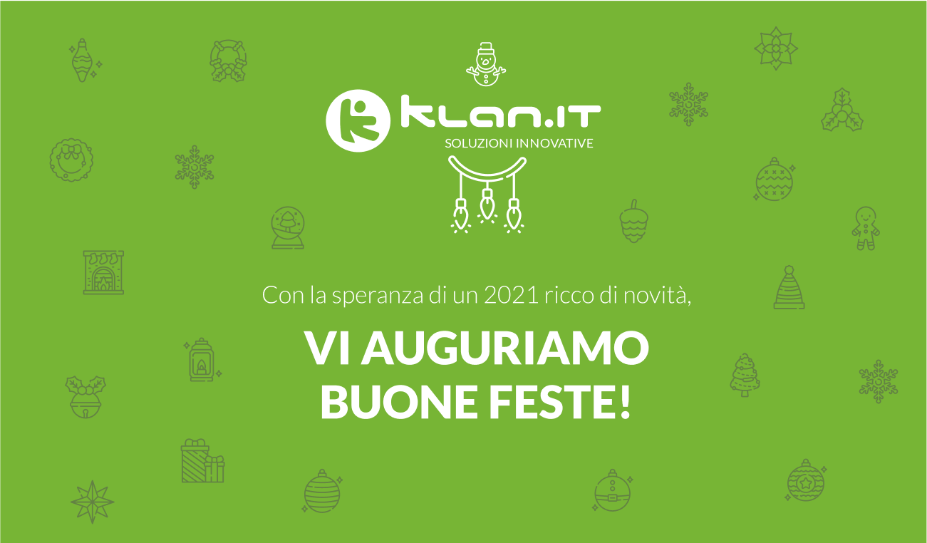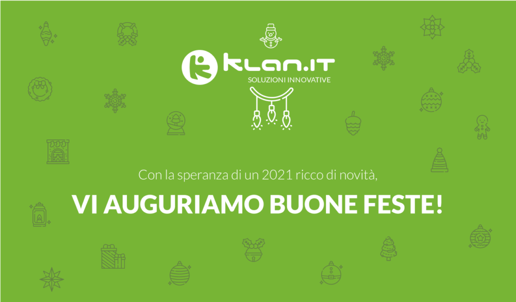 Per noi di Klan.IT, quest’anno è stato un privilegio essere al vostro fianco nelle rivoluzioni digitali che avete affrontato. Mai come in questo periodo abbiamo toccato con mano quanto la tecnologia possa semplificare, aiutare, agevolare, avvicinare: il nostro impegno continua ad essere quello di trovare soluzioni innovative in grado sia di migliorare le attività di ogni giorno, sia di superare gli imprevisti.