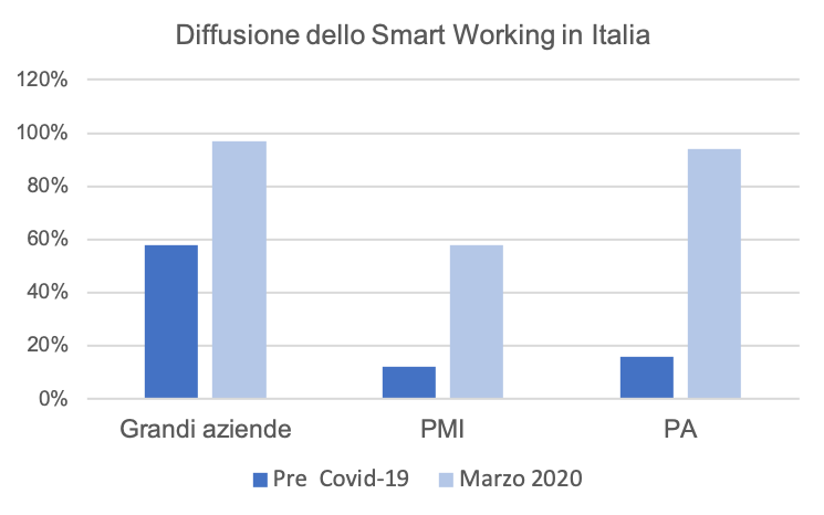 Secondo l’Osservatorio “Smart Working tra Remote Working e Smart Office” del Politecnico di Milano, prima dell’emergenza sanitaria lo Smart Working toccava il 58% delle grandi aziende, il 12% delle PMI e il 16% delle PA, per un totale di 570.000 lavoratori. A marzo 2020 i numeri sono saliti vertiginosamente, coinvolgendo il 97% delle grandi aziende, il 58% delle PMI e il 94% delle PA, per un totale di 6,58 milioni di lavoratori.